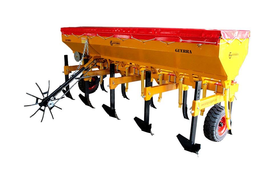 - Fabricado con distribuidores regulables de producto, ajustándose a las cantidades necesarias para la planta/semilla localizándose en la misma.